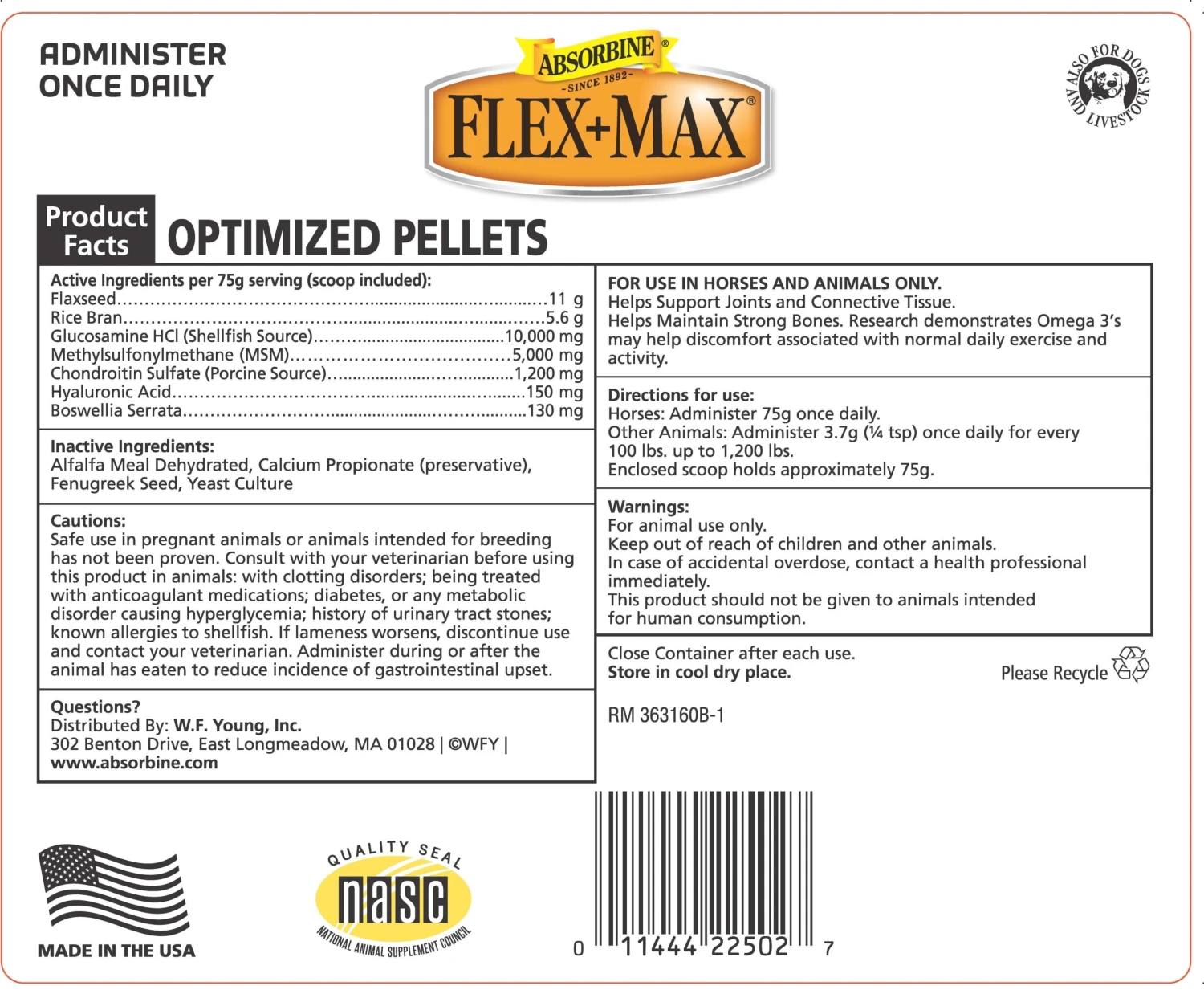 All-inclusive horse joint supplement. Flex+Max® offers comprehensive joint care featuring enhanced ingredient levels for guaranteed results—all in a horse joint supplement offering a highly palatable formula with no fillers. Flex+Max also offers “guaranteed levels of glucosamine and chondroitin,” which is important when you consider that levels of active ingredients in supplements can vary widely, impacting the results they’re able to deliver. Formulated with 10,000 mg of glucosamine, 1,200 mg of chondroitin sulfate, 5,000 mg of MSM & 150 mg of HA.