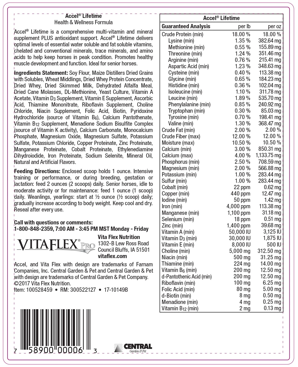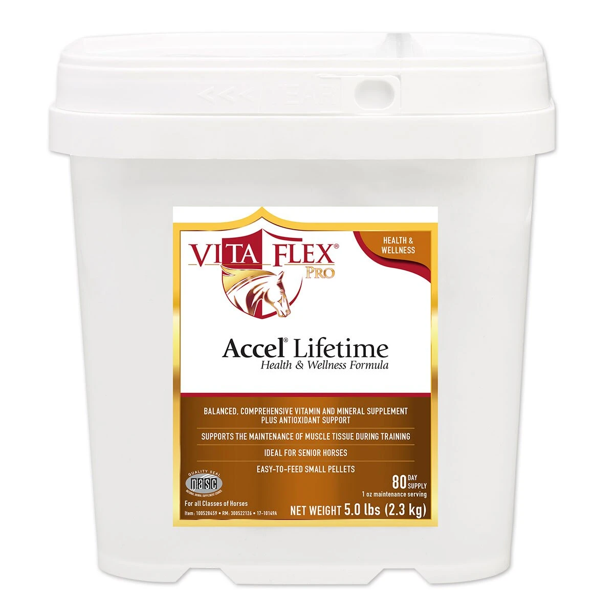 Accel® Lifetime is a comprehensive multi-vitamin and mineral supplement PLUS antioxidant support. Accel® Lifetime delivers optimal levels of essential water soluble and fat soluble vitamins, chelated and conventional minerals, trace minerals, and amino acids to help keep horses in peak condition. Promotes healthy muscle development and function. Ideal for senior horses.