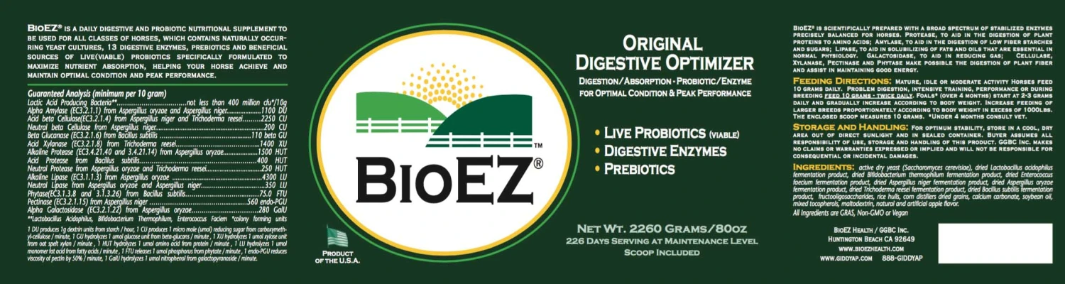 A healthy digestive system is key to your horseโs overall well-being. Giddyap Girls BioEZยฎ is specifically designed to support healthy digestion and optimal hindgut function in horses. It provides a blend of probiotics, digestive enzymes, and prebiotics to help ensure nutrient absorption and proper bacterial digestion. Whether youโre looking to provide support for your horse who has had occasional digestive issues in the past or you want to ensure your healthy horse has optimal digestive efficiency, Giddyap Girls BioEZยฎ is your affordable and easy-to-use answer.