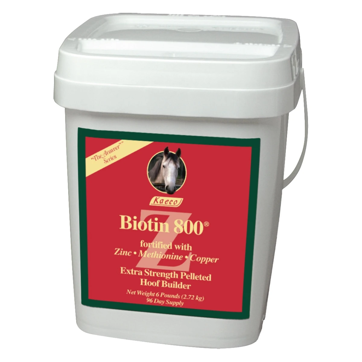 Biotin 800Z is a palatable, extra-strength hoof supplement for horses. It is formulated with concentrated, essential ingredients needed for healthy, strong, and resilient hooves. These key ingredients will also support the overall condition of your horseโs skin and coat. Each one ounce serving provides biotin, zinc, copper, methionine, amino acids, minerals, and omega fatty acids. In addition, the formula includes yeast cultures to support the proper digestion of nutrients. Biotin 800Z is available in an easy-to-give alfalfa-based pellet with molasses flavoring.