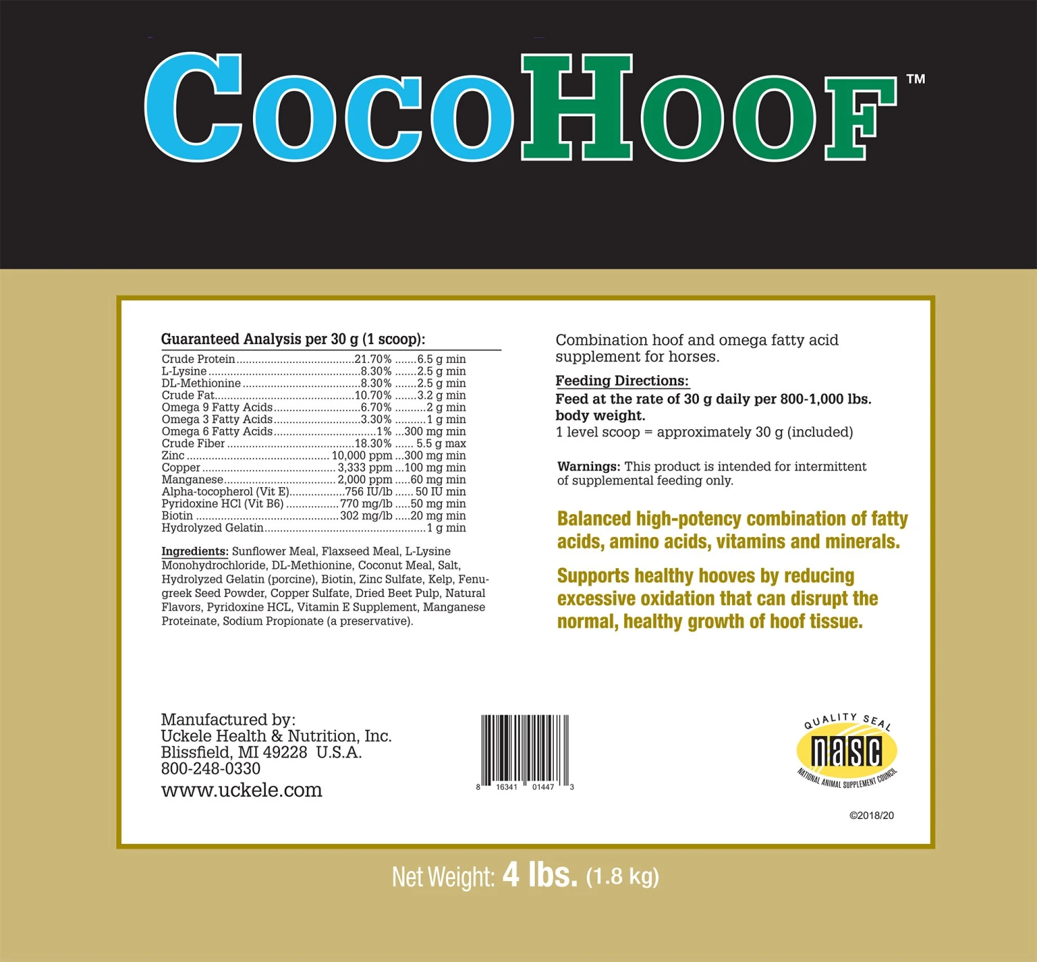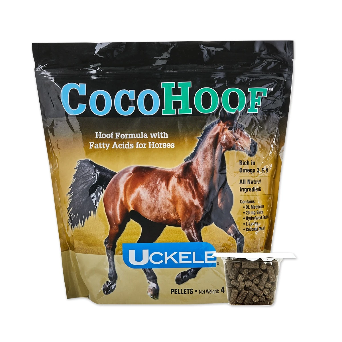 CocoHoofโข Pellets encourage normal hoof growth and give weak, shelly hooves a boost with omega fatty acids, amino acids, and essential vitamins and minerals. Nutrients such as biotin, lysine, methionine, copper, and zinc support strong, tough hooves. Key in the production of keratin, a major protein, these same nutrients are also central to skin and coat health. CocoHoof’s well-balanced formula additionally contributes to hoof and skin integrity by reducing excessive oxidation, which can disrupt the production of healthy tissue.