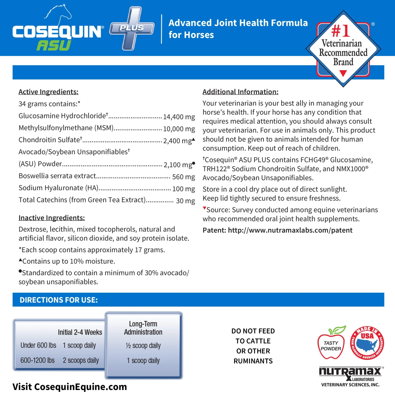 Cosequin® is the #1 veterinarian recommended joint health supplement brand*. Cosequin ASU Plus is veterinarian formulated with avocado/soybean unsaponifiables (ASU), glucosamine, chondroitin sulfate, methylsulfonylmethane (MSM), boswellia serrata extract, green tea extract and HA to provide joint health support for equine athletes regardless of discipline or performance level. When performance matters, choose Cosequin.