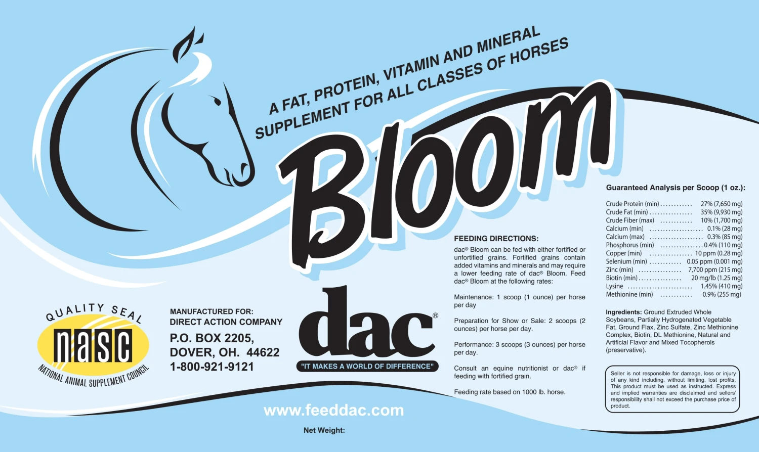 dac® Bloom is a fat, vitamin, and mineral supplement designed for all classes of horses. It’s designed to support overall skin and coat health as well as a normal body condition, making it especially beneficial for hard keepers or senior horses who struggle to maintain their ideal weight. This formula provides Cool Calories 100®, a concentrated powdered vegetable fat supplement that provides added calories as well as essential fatty acids for skin and coat health. As added support for skin, coat, and hoof health, this supplement also contains ground flaxseed, biotin, zinc, methionine, and lysine.