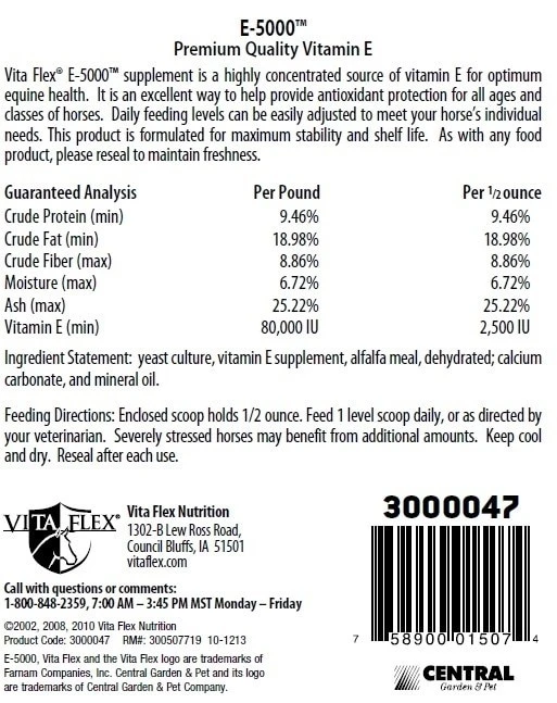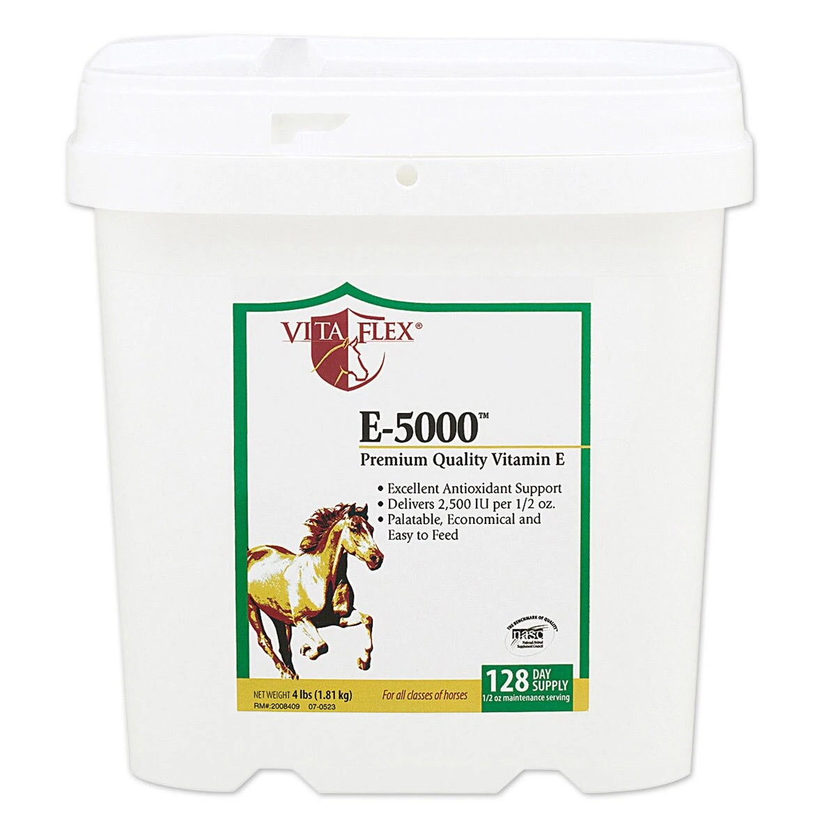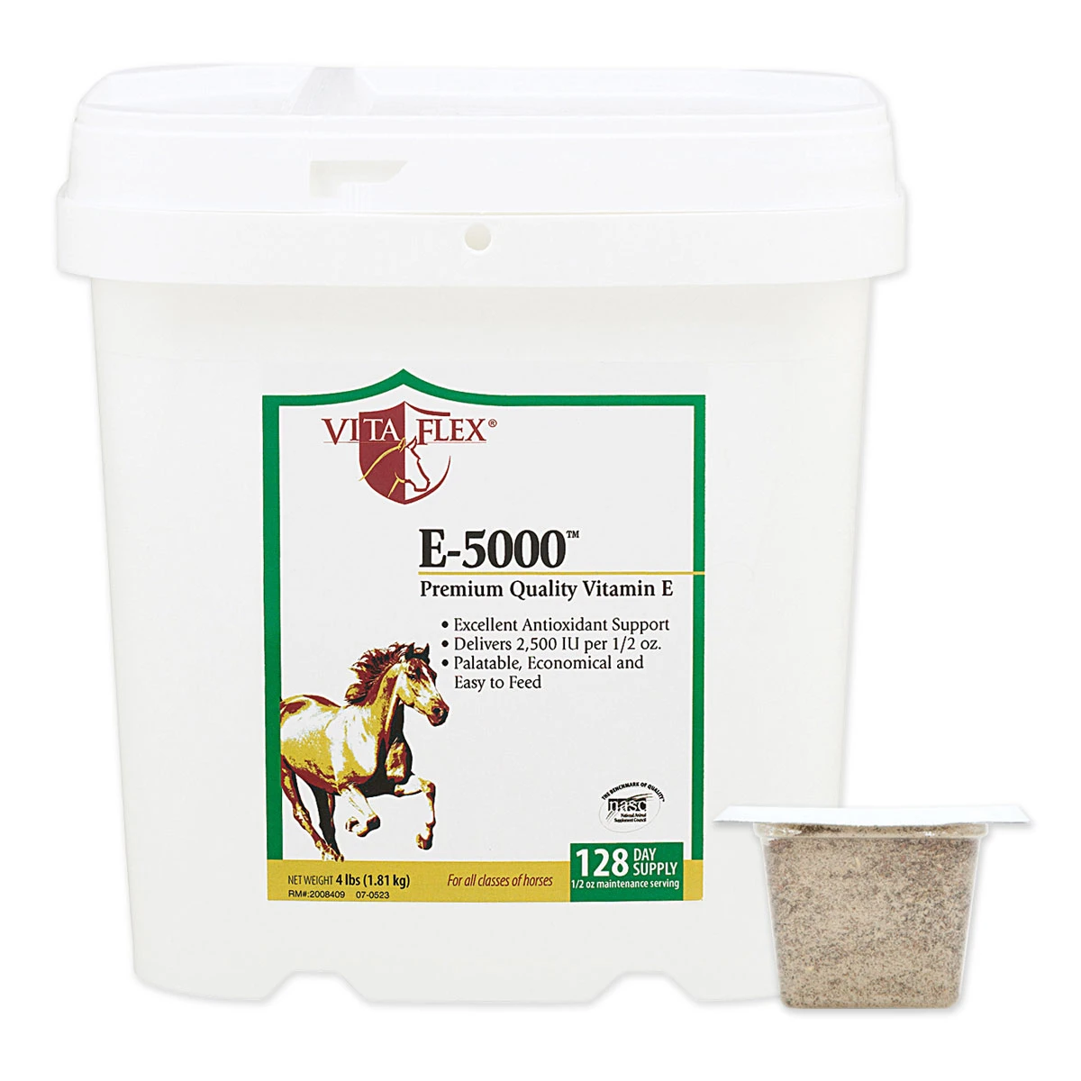 Recent research has prompted leading equine nutritionists to suggest increased dietary intake of Vitamin E. E-5000 is a highly concentrated source of Vitamin E with 5,000 IUs per ounce.