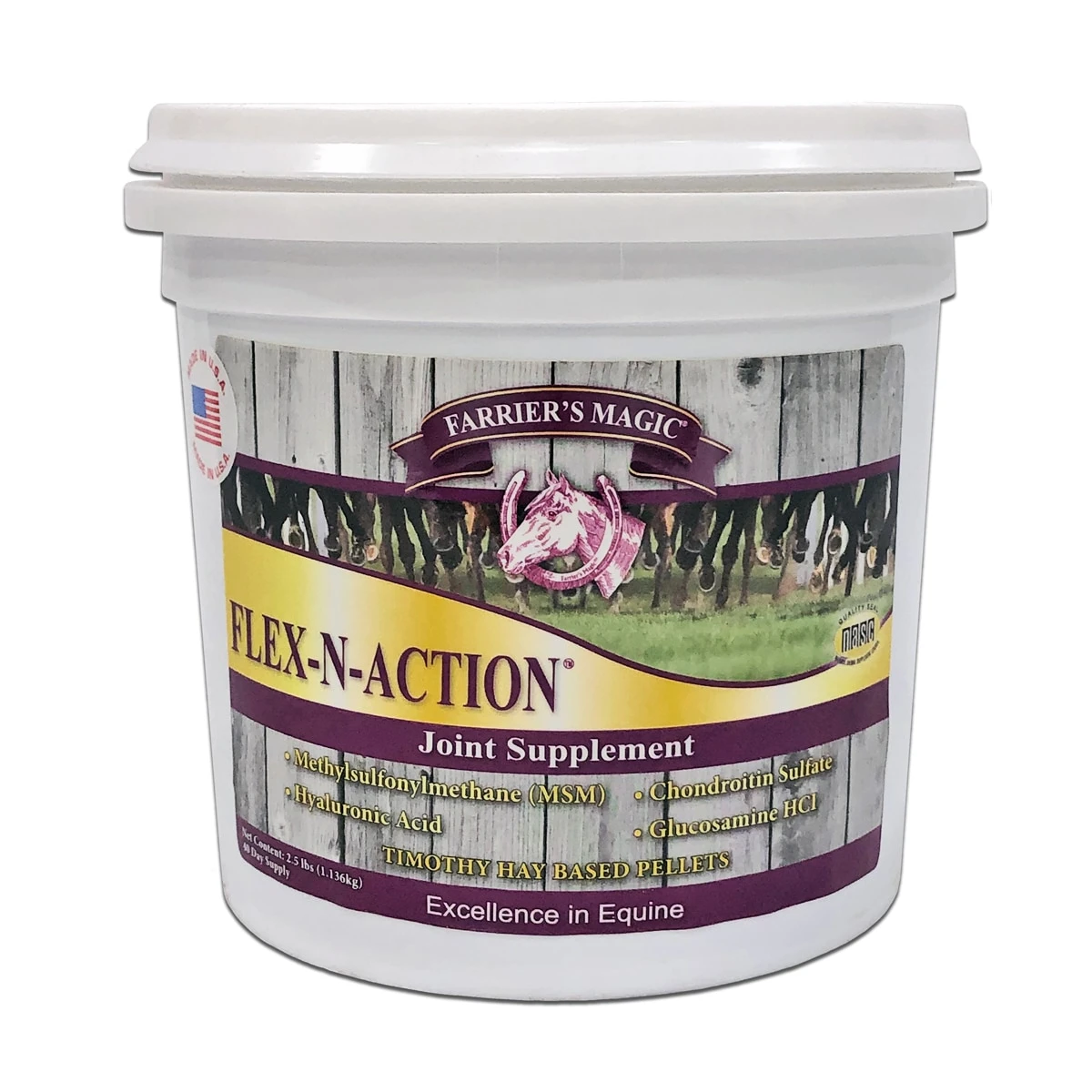 Farrier’s Magic FLEX-n-ACTION Pelleted Joint Product supplies researched ingredients including glucosamine HCl, hyaluronic acid, chondroitin sulfate, and generous levels of ultra pure MSM. All of these connective tissue components are blended in a very palatable base of premium quality timothy-based pellets. For support of horses facing the strains of aging, training, and competition, and provides support of connective tissue and natural lubricant.
