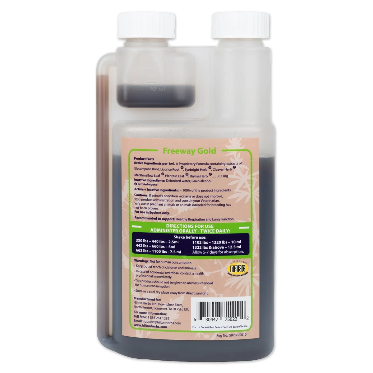 Freeway Gold is formulated to help horses maintain healthy, efficient airways all year round. Freeway Gold is an excellent choice for stabled horses or those with limited turnout. This formula contains tinctures of elecampane, liquorice, eyebright, cleaver, marshmallow, plantain, and thyme.