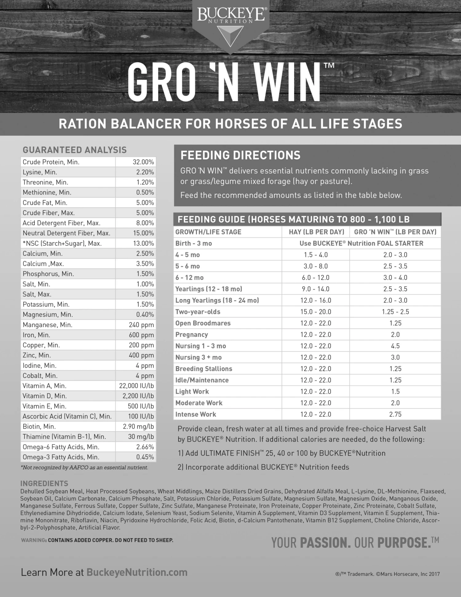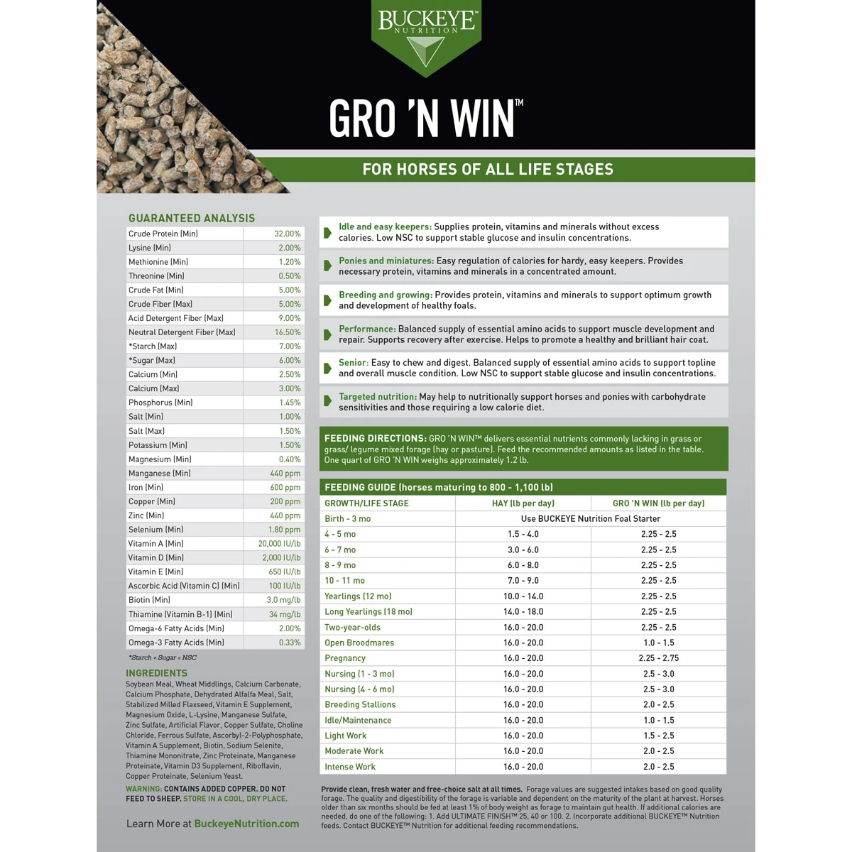 Gro ‘N Win is a pelleted ration balancer that delivers essential nutrients that grass and grass/legume mixed forage commonly lacks. It supplies protein, vitamins, and minerals without excess calories, making it a perfect choice for easy keepers, ponies, and other horses that don’t need a full serving of grain to maintain their ideal weight. This versatile feed provides five times the amount of vitamins and minerals found in most feeds and is formulated to complement a forage-first diet. In addition, it includes essential amino acids to help maintain your horse’s topline and support muscle development.