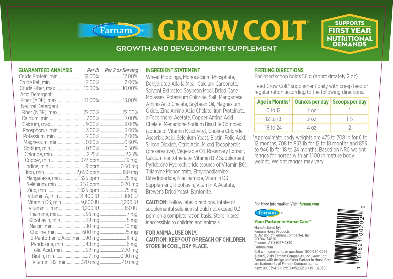 Grow Colt Growth & Development was specifically formulated for foals and young, growing horses. Great for use with creep feed, this supplement includes 27 nutrients, such as protein, amino acids, vitamins, and minerals, that are necessary for the health of growing foals. It supports normal, consistent growth and development as well as proper bone and connective tissue development. Finally, it also provides nutrients to help support the immune system.