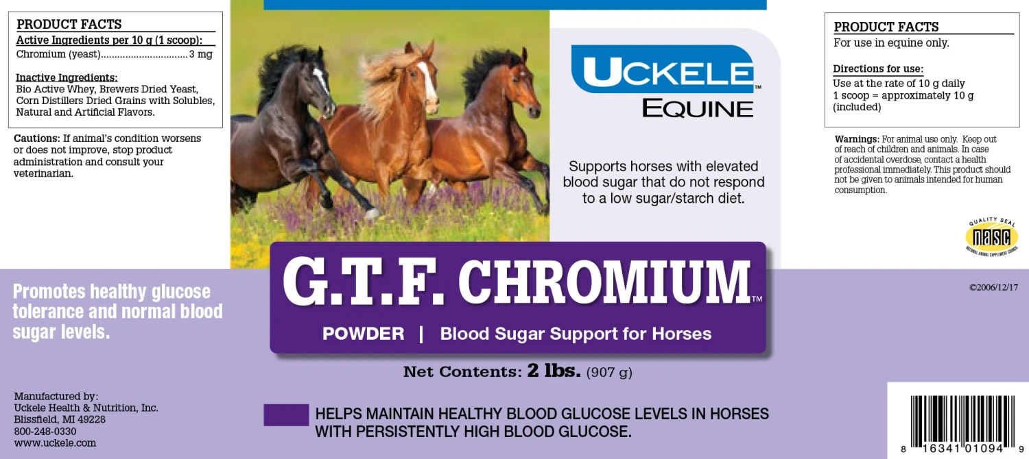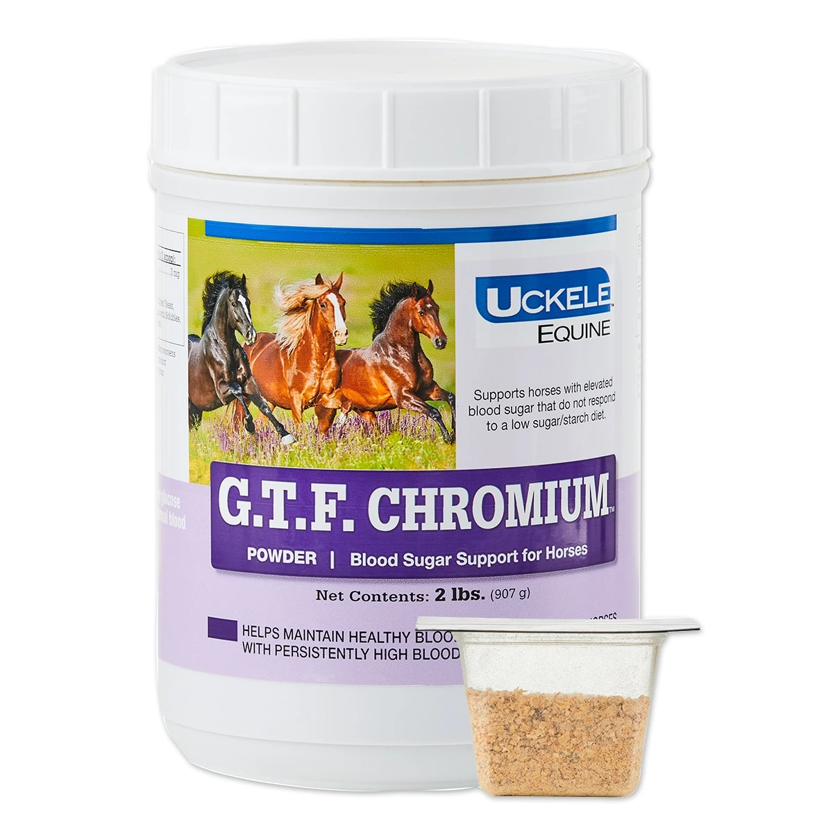 GTF Chromium Yeast is a palatable powder for horses needing extra support to maintain normal metabolic function. An excellent source of chromium, this supplement is great for performance horses on high grain intakes or horses requiring help achieving normal blood sugar levels. Chromium is a trace mineral that works with insulin to regulate blood sugar. Insulin’s primary function is to stimulate the transport of sugar from the bloodstream to the cell. Chromium helps metabolize sugar by facilitating its uptake into the cells. Research has shown that chromium supplementation to horses on high grain diets improves the clearance of sugar from the blood after meals and increases the metabolism of glucose inside the cells. Chromium does not improve insulin sensitivity, but when used appropriately can help maintain normal blood glucose levels.