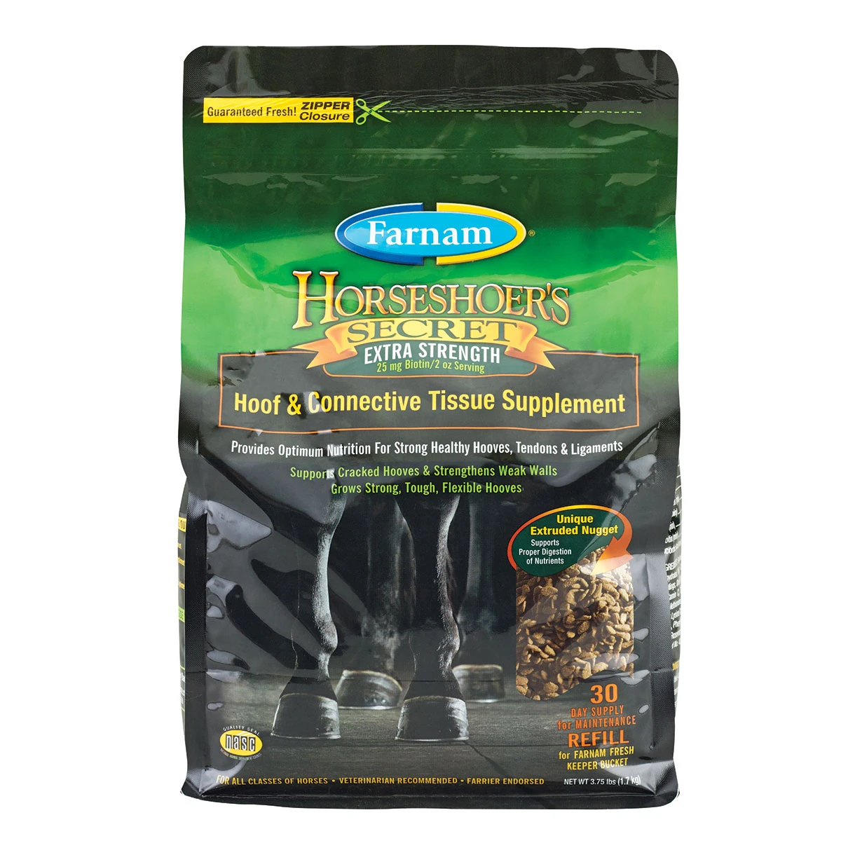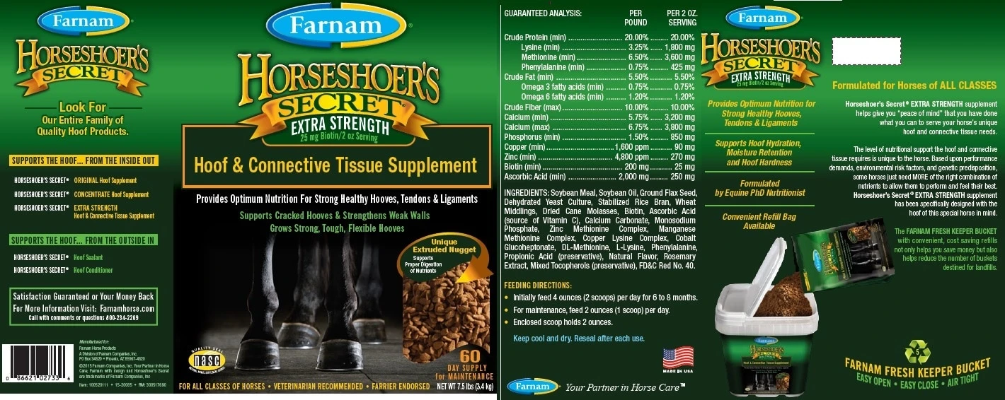 Strong hooves and healthy tendons and ligaments are essential if you and your horse are going to accomplish your goals. Now you can feel confident you’re providing vital nutritional support for your horse’s foundation with Farnam® Horseshoer’s Secret® EXTRA STRENGTH Hoof & Connective Tissue Supplement. The easy-to-feed nuggets provide a comprehensive selection of ingredients to support normal hoof hydration, moisture retention, and hoof hardness, as well as proper digestion of nutrients.
