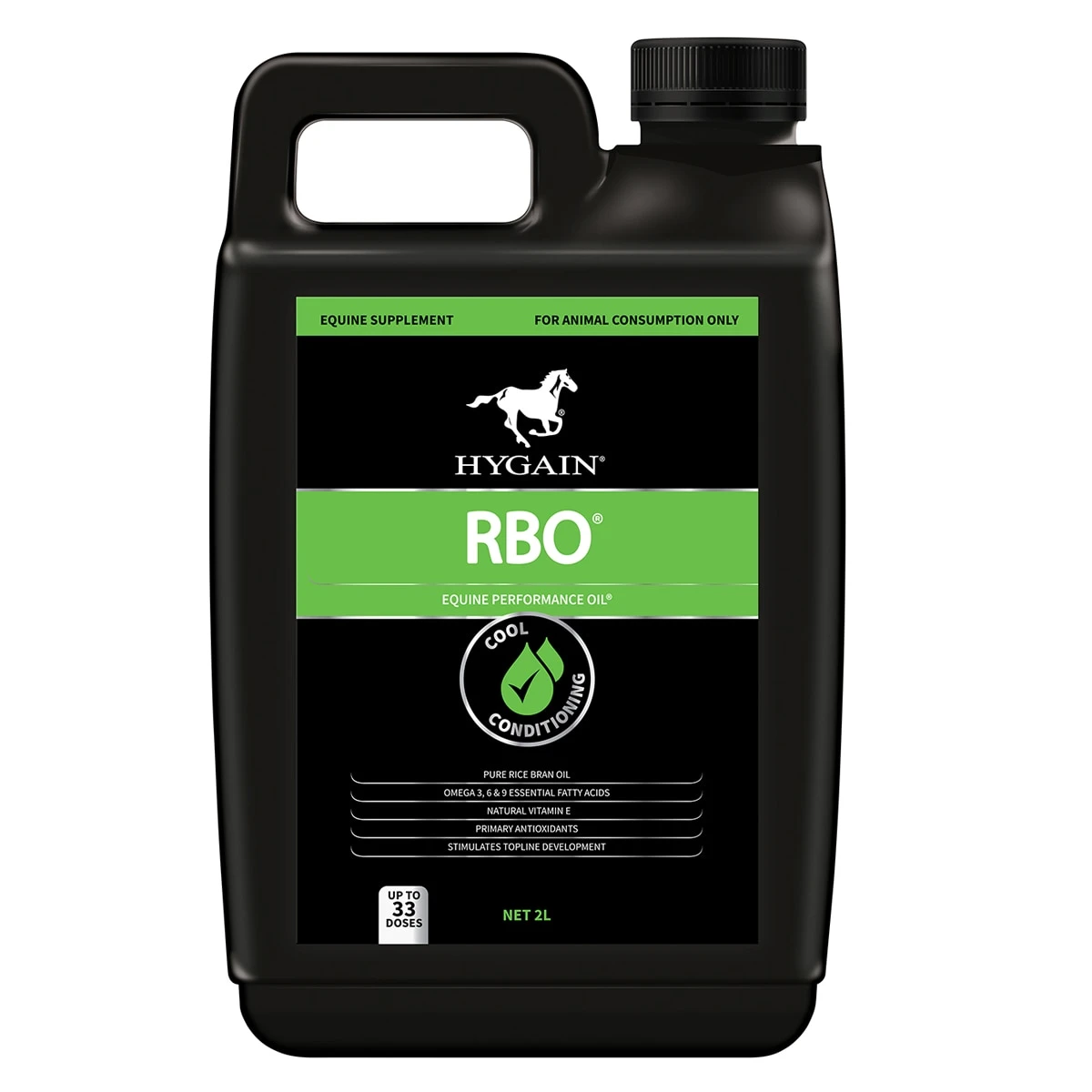 Hygain® RBO® Equine Performance Oil is a blend of pure rice bran oil, Omega essential fatty acids and natural antioxidants formulated for all equines. This unique oil is high in natural Vitamin E and aids as a carrier for fat-soluble vitamins. This helps increase energy content of the diet while reducing excitability and oxidative stress in horses. Ideal for high-performance horses, endurance horses, horses who require weight gain, horses prone to tying up and gastric upset, show and sales preparation.