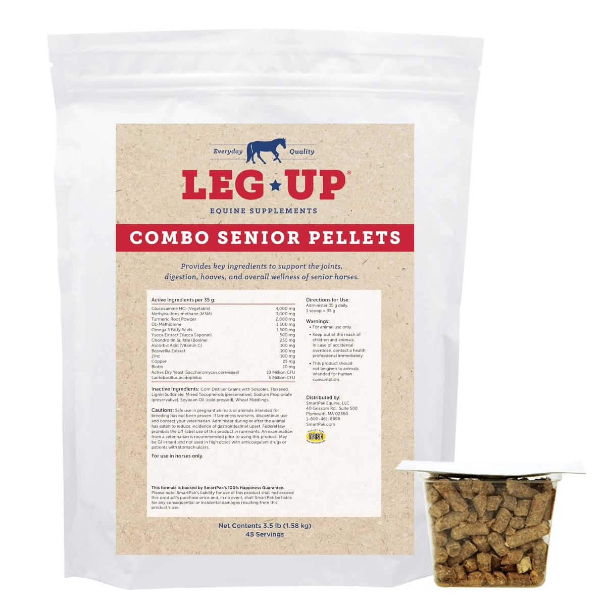 Leg Up® Combo Senior Pellets provide joint, hoof, digestive, skin, coat, and overall wellness support for older horses in tasty, convenient pellets that your horse will love. This formula includes glucosamine, chondroitin sulfate, MSM, yucca, boswellia, vitamin C, and 2,000 mg of turmeric to support healthy joints and help address discomfort associated with normal exercise and aging. Key ingredients such as biotin, methionine, zinc, and copper help keep your senior’s hooves strong and healthy. Plus, probiotics and yeast offer hindgut support for a normal digestive system. Finally, omega 3s from flaxseed support skin and coat health as well as overall wellness. This well-rounded supplement is an unbeatable value and is a great choice for active seniors as well as retired horses.