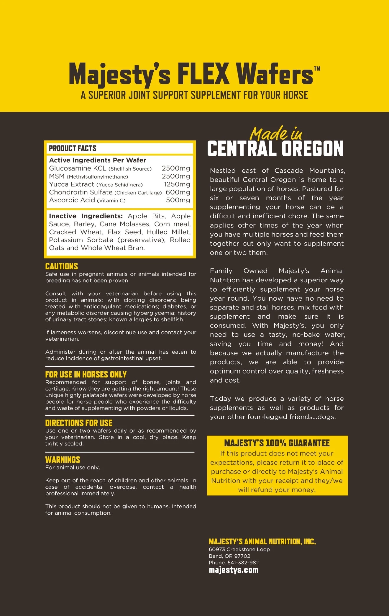 Majesty’s Flex Wafers are an easy, tasty way to give your horse a joint supplement. Each wafer contains 2,500 mg of glucosamine, 2,500 mg of MSM, 600 mg of chondroitin, 1,250 mg of yucca, and 500 mg of vitamin C to support healthy joints.