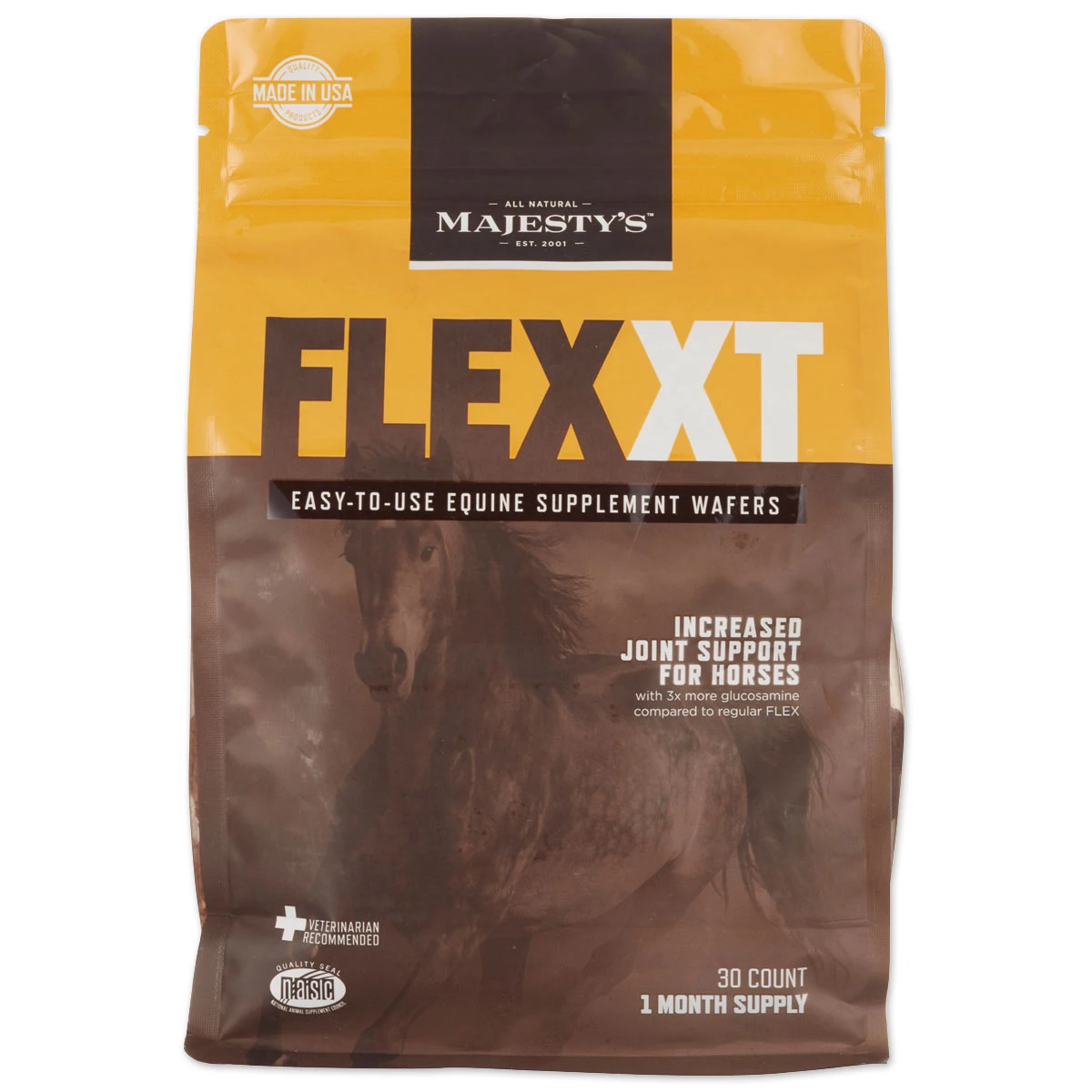 Majesty’s Flex XT Wafers offer the same joint health ingredients as the original Majesty’s Flex Wafers in higher levels for horses that need more support. It contains three times more glucosamine than the original formula, as well as increased levels of MSM, yucca, and vitamin C for well-rounded support. These tasty, easy-to-use wafers are a great way to help ensure that your horse is always getting the right amount of joint support every time.
