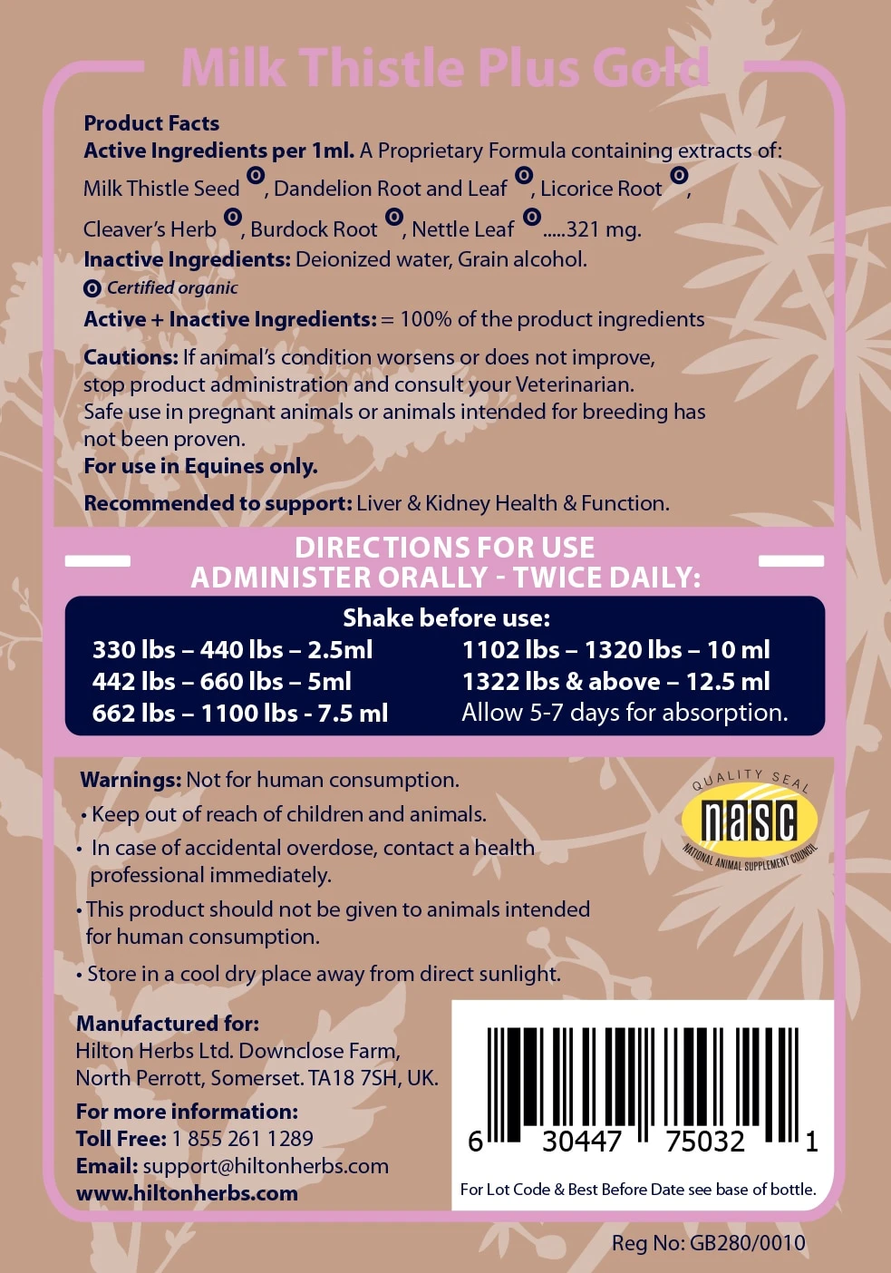 Milk Thistle Plus was formulated by Hilton Herbs to maintain and support liver and kidney function as well as the normal elimination of toxins in horses. This unique supplement provides milk thistle seed along with a combination of other herbs, including dandelion root, burdock root, cleaver herb, nettle leaf, liquorice root, and dandelion leaf. Available in a dry form and in a liquid form.