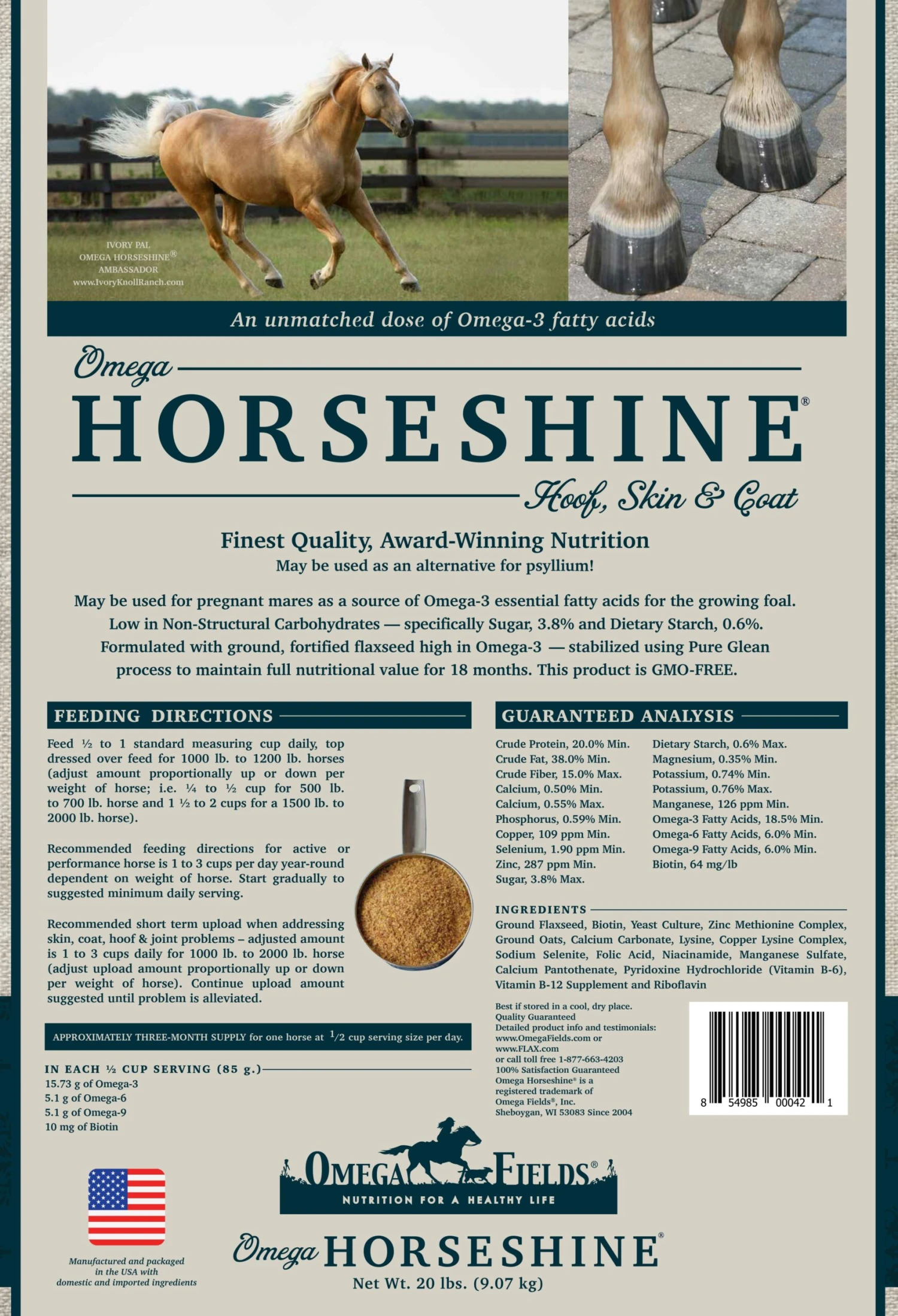 Omega Horseshine® is a premium omega 3 essential fatty acid supplement made with fortified, stabilized, ground flax. Horse Journal’s: “Product of the Year!”, “Our First Pick – Most Concentrated Source of Quality Omega-3”, & “Recommended Immune-Boosting Product”. Recommended by John Lyons’ Perfect Horse.