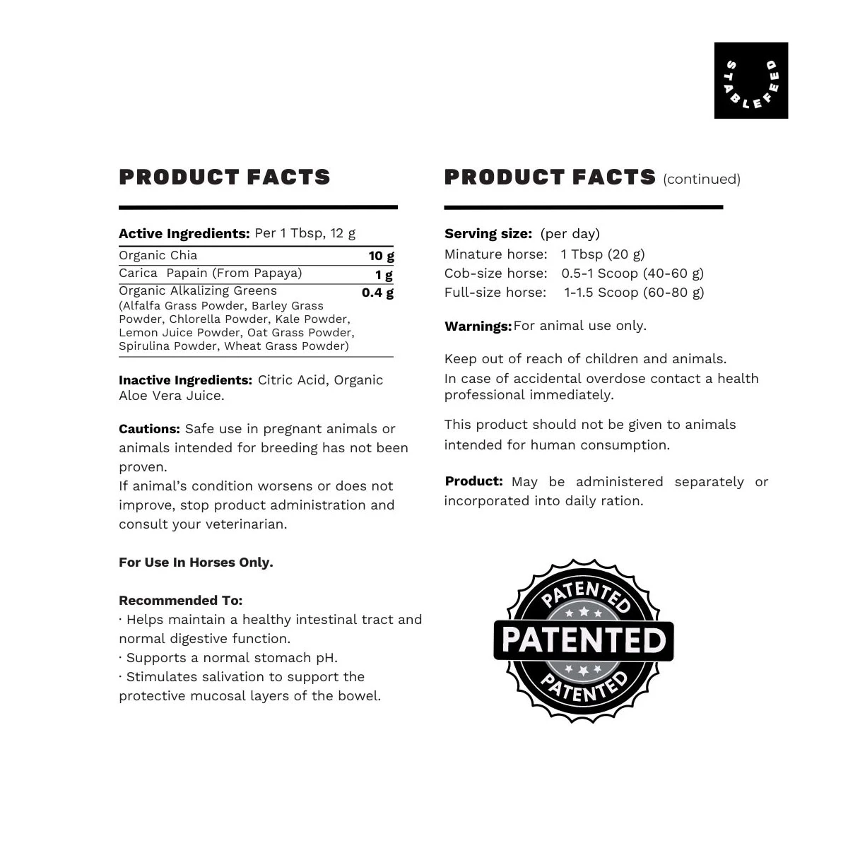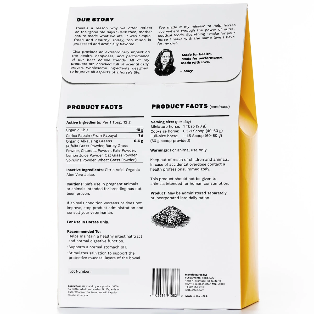StableFeed’s Papaya Chia was formulated to promote proper digestion in horses. The high mucosal content of chia work synergystically with organic alkalyzing greens and aloe vera to support a healthy digestive environment. Crafted with papain from Carica papaya which is known to break down proteins and help stimulate salivation that aids in digestion. Papaya also contains large amounts of naturally occuring pectin that may help soothe the lining of the stomach. All together, these ingredients work to help deliver a superior gastric support supplement.