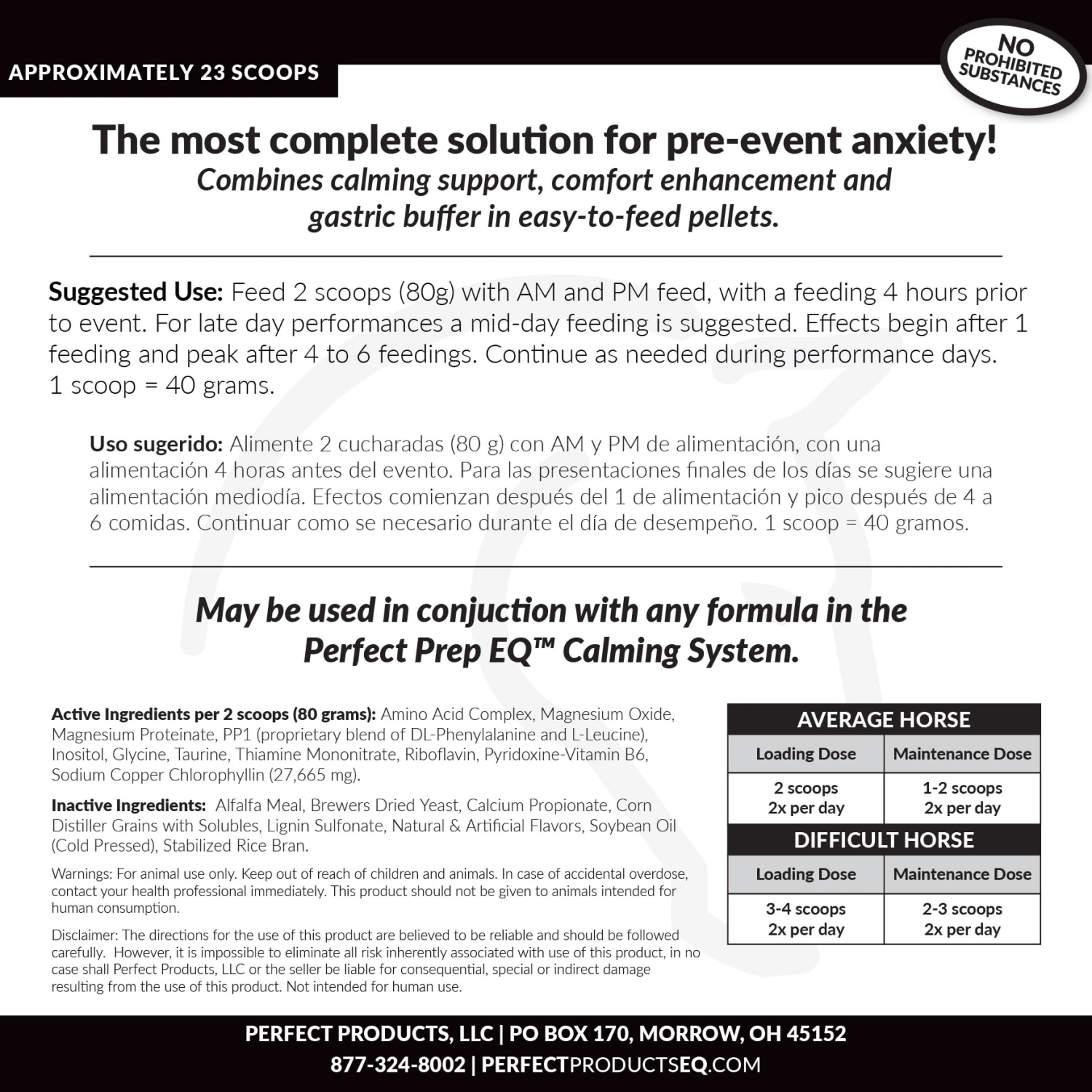 Perfect Prep EQ™ Sane & Sound is calming supplement designed to provide the most complete solution for pre-event anxiety. It combines ingredients for a focused attitude, comfort, and a healthy stomach to help your horse or pony stay relaxed and compliant. This unique approach creates unmatched calming support for horses that suffer from “stage fright” or become difficult in the show ring. The ingredients in this formula include a proprietary blend of an amino acid complex, magnesium, PP1 (a proprietary blend of DL-phenylalanine and L-leucine), inositol, glycine, taurine, thiamine, riboflavin, pyridoxine, and sodium copper chlorophyllin. Available in easy-to-administer pellets.