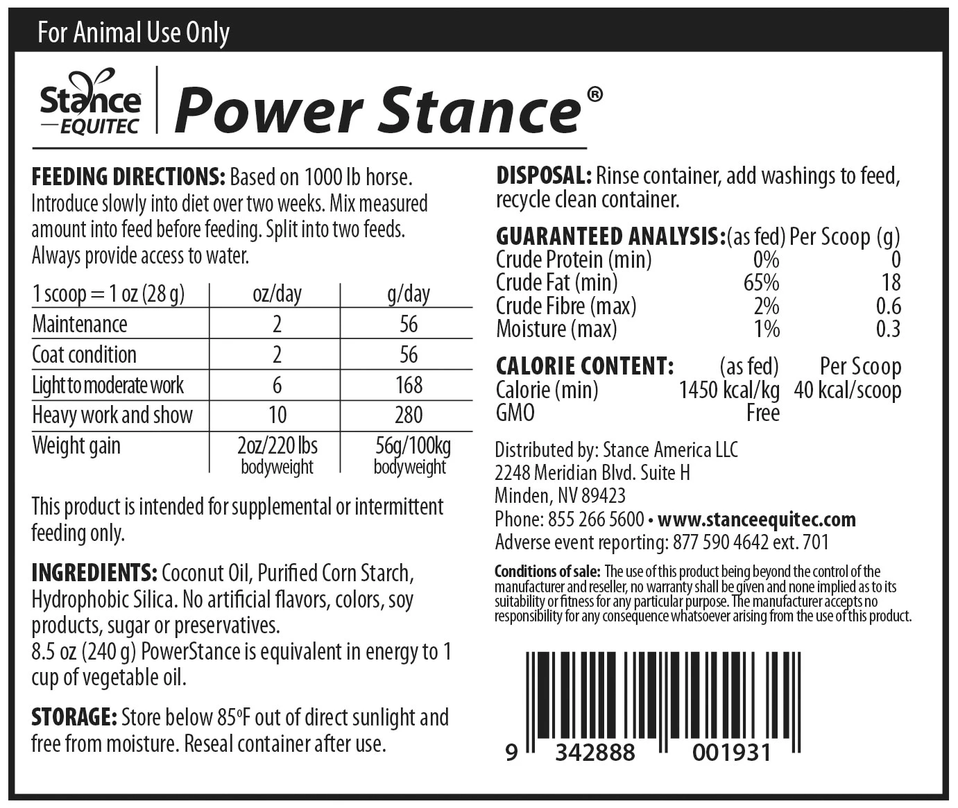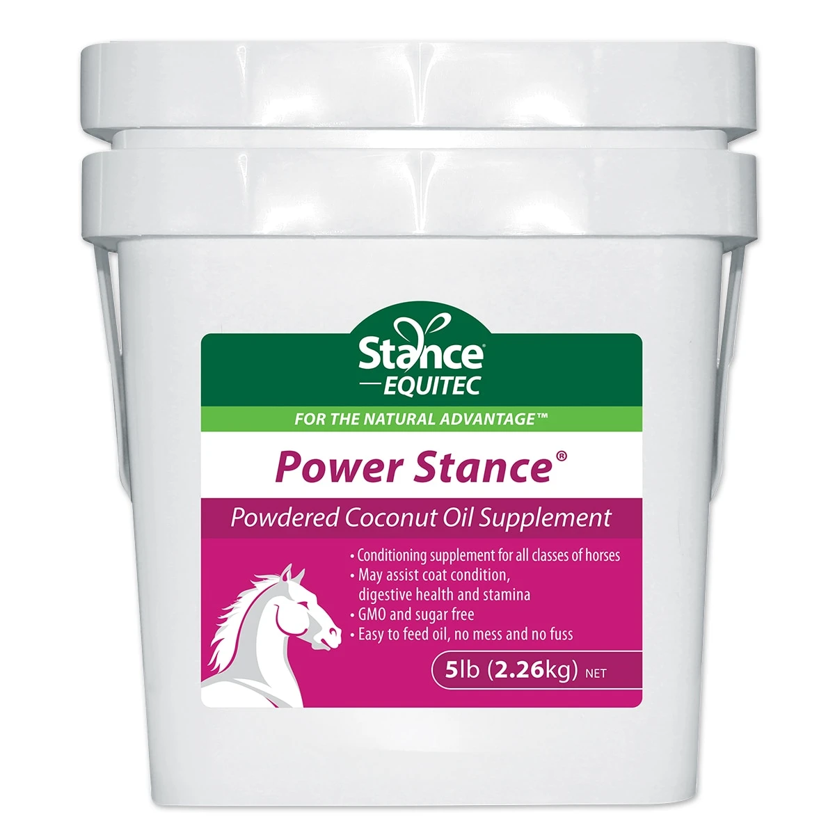 Power Stance® is a unique powdered coconut oil supplement. Coconut oil is a rich source of medium chain triglycerides (MCTs), which are easier to digest, absorb, and convert to muscle energy than the long-chain fatty acids found in other vegetable oils. Plus, because it’s a saturated oil, it has a long shelf life and is not prone to rancidity. This formula may be used to support gut health, weight gain, and a sleek and healthy coat. It is an odorless white powder, making it easy to mix into your horse’s feed.