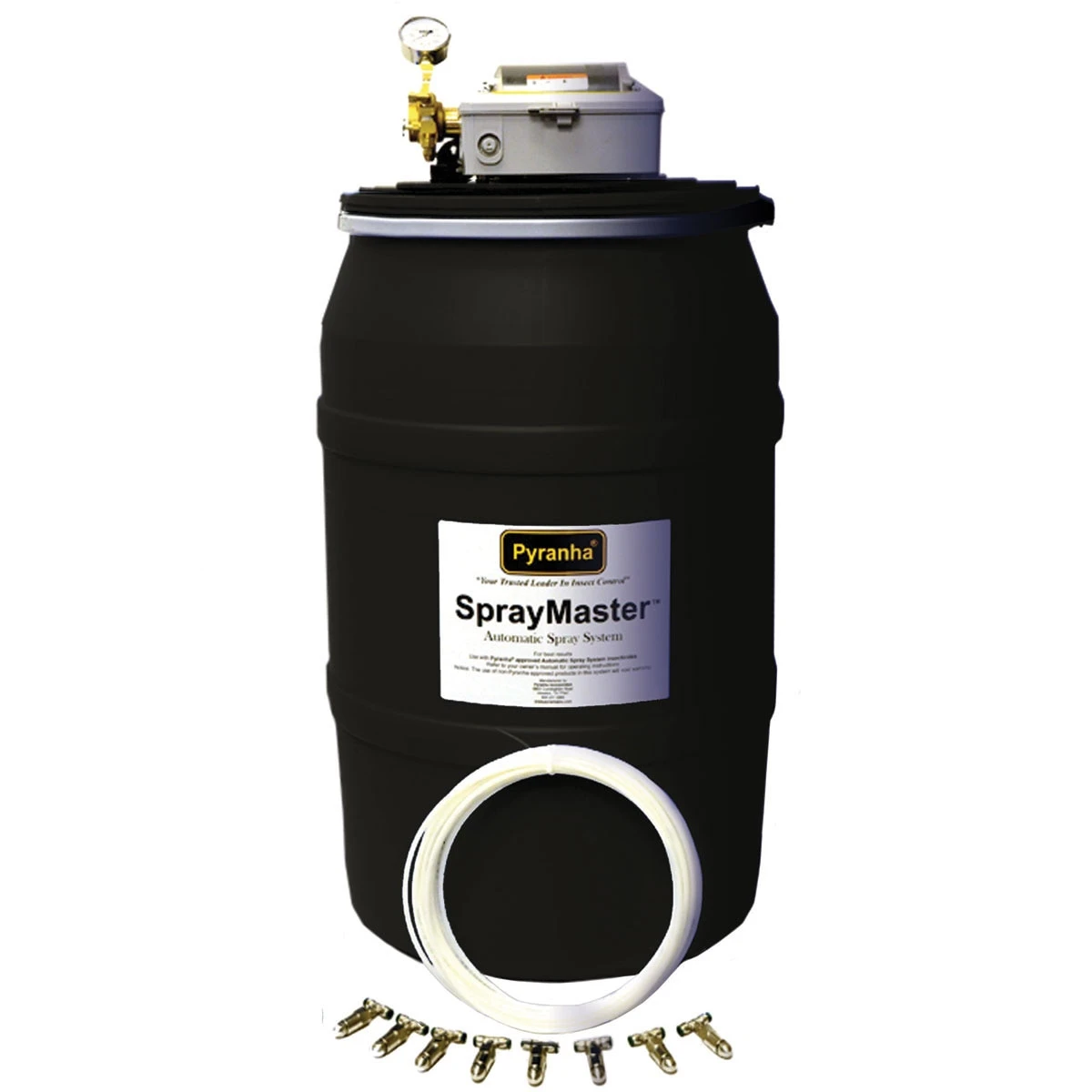 The Pyranha Spray Master System includes a 1/2 horsepower electric motor-driven pump controlled by a solid state electronic timer. This timer is programmed to dispense an inse…