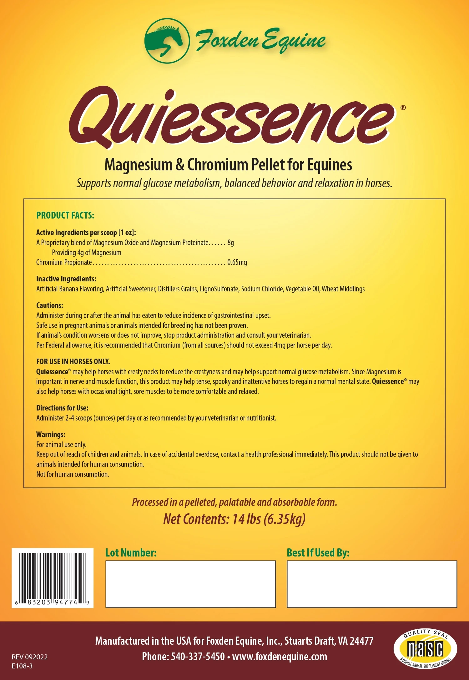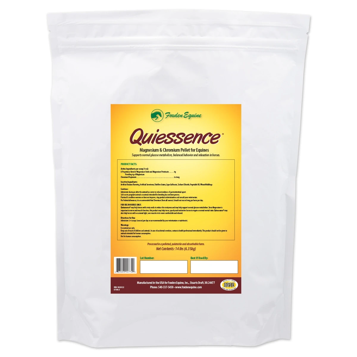 Quiessence® provides high levels of Magnesium and Chromium in a pelleted form. Quiessence® is a supplement formulated to support normal glucose metabolism, balanced behavior, and relaxation in horses. Equines diets are often low in Magnesium, especially for equines in work, who are kept stalled, or are fed feeds that are processed with preservatives. Supplementing with Magnesium to these horses, support proper nerve and muscle function. Quiessence may be helpful for horses that are overweight and cresty-necked, and may also help with calming.