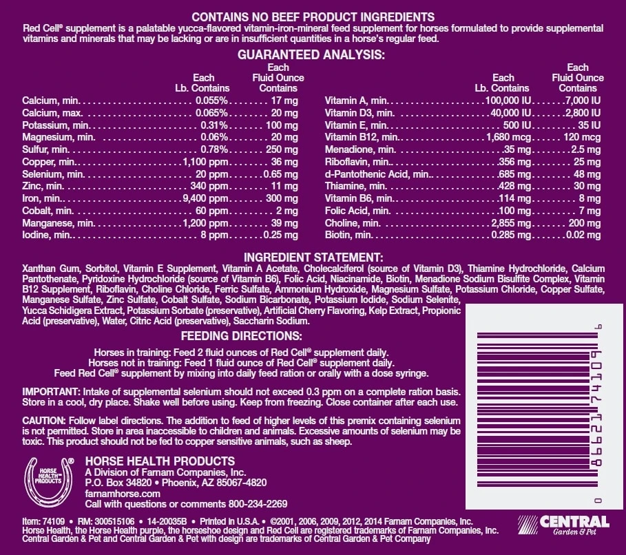 Red Cell is a palatable yucca-flavored vitamin-iron-mineral supplement for horses. Red Cell is formulated to provide supplemental vitamins and minerals that may be lacking or are in insufficient quantities in a horse’s regular feed.