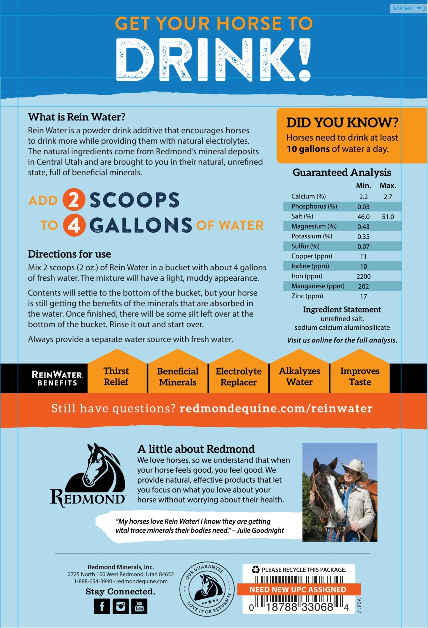 Many horses are deficient in minerals and even natural feed lacks some of the nutrients your horse needs. Rein Water Thirst Relief is a powder drink additive that plays an important role in your horseโs health by providing the essential trace minerals missing from many natural forages. This formula contains a perfect blend of the essential trace minerals and electrolytes your horse needs to live a healthy, balanced life. It also encourages normal drinking, which is an essential part of equine health. It has a natural taste that horses love with no added sweeteners.