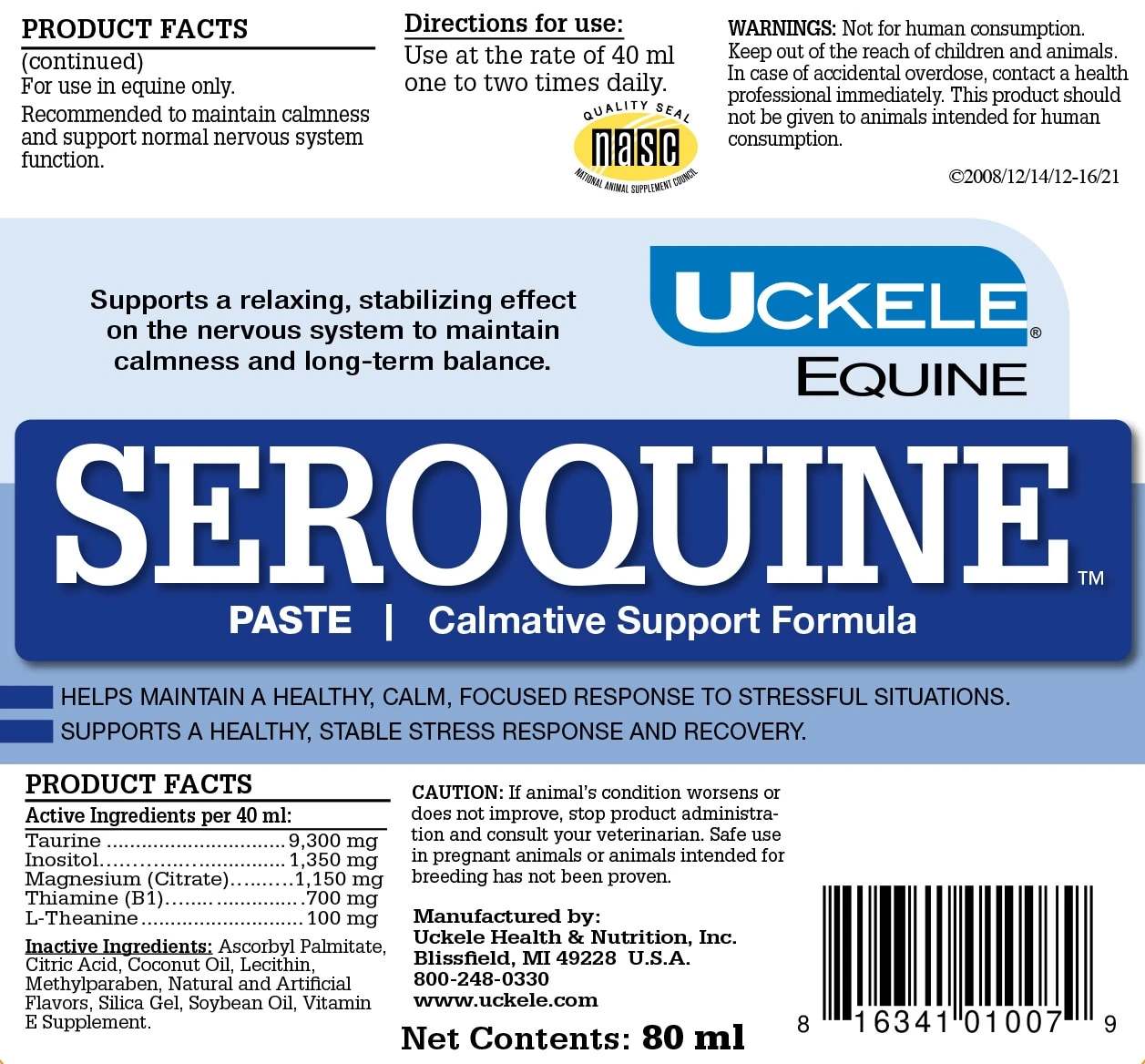 Fast acting and convenient, Seroquine™ Paste is perfect to use as needed before travel, performance, or stressful events to help keep your horse calm and relaxed. Seroquine supports an even demeanor while maintaining alertness. This formula may reduce hyperactivity and promote relaxation and is designed to do so without creating undesired drowsiness. The key ingredient, magnesium, promotes normal energy production and proper nervous system function. Taurine, thiamine(B1), theanine, and inositol help modulate the stress hormones cortisol and adrenaline. Seroquine is formulated to balance the stress response during separation, travel, or tension caused by changes in your horse’s daily routine. A great choice for performance horses to help keep them calm and relaxed before, during, and after competition while maintaining focus. Also available in powder and pellet form for easy daily feeding.
