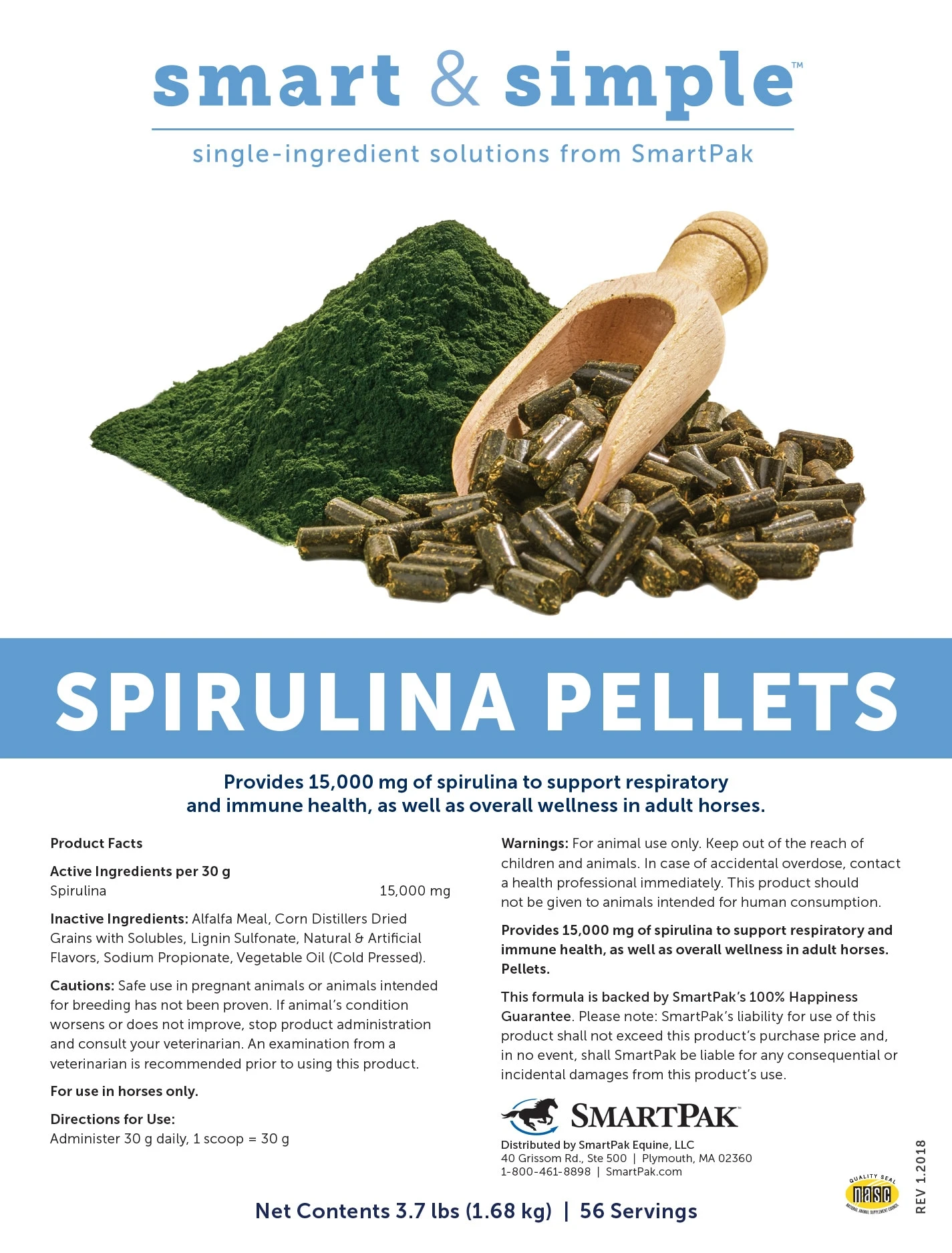 Spirulina is a fresh water blue green algae known for its numerous health benefits such as supporting immune function and a normal response to inflammation. This ingredient has also been reported to help horses prone to respiratory issues, especially those associated with seasonal allergies. Smart & Simple Spirulina Pellets for Horses are an ideal choice to provide daily support for horses with immune or respiratory challenges, as well as other seasonal allergic conditions. Apple-banana flavored pellets are a no mess, convenient, and tasty way to provide this beneficial ingredient!
