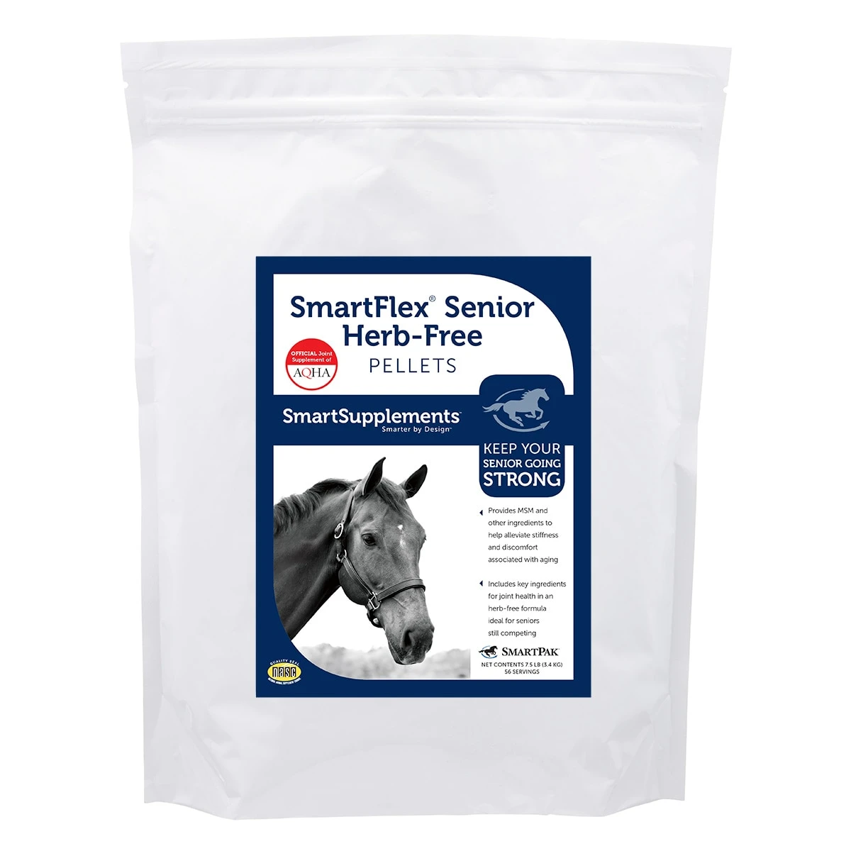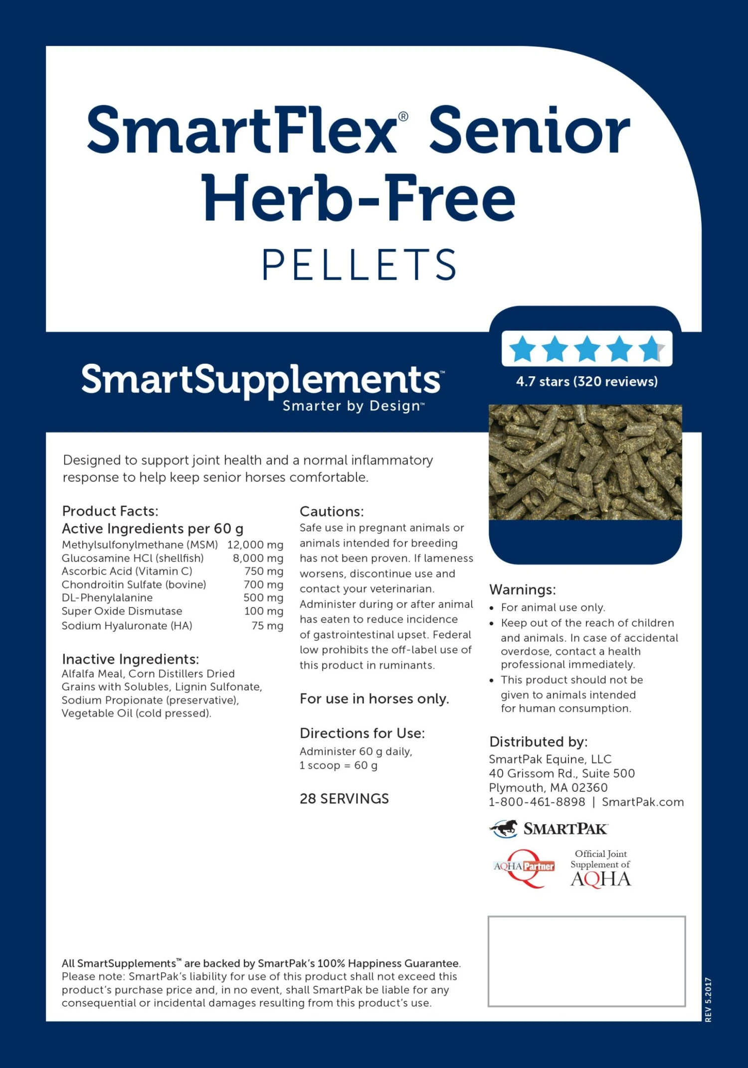 For joint support, SmartFlex Senior Herb-Free Pellets provide 8,000 mg of glucosamine, 700 mg of chondroitin sulfate, 75 mg hyaluronic acid, and 12,000 mg of MSM. This formula also contains 500 mg of the amino acid phenylalanine to help address stiffness and discomfort associated with aging. And because senior horses benefit from extra antioxidants, this supplement also contains vitamin C and super oxide dismutase. Your horse will love these tasty pellets!