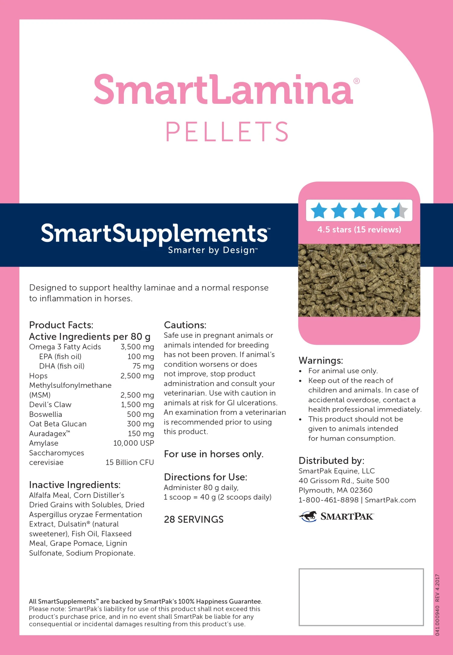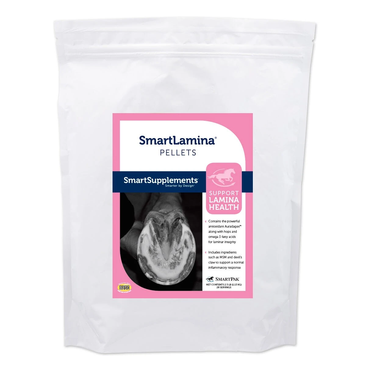 This innovative hoof health formula includes hops and omega 3 fatty acids, two ingredients demonstrated by research to support healthy laminae. SmartLamina Pellets also include the super-potent antioxidant Auradagex™ to combat oxidative stress in hoof tissues, along with MSM and devil’s claw to promote a healthy inflammatory response and help manage discomfort in the foot. SmartLamina Pellets are specially designed to help maintain laminar health in easy keepers and horses with insulin resistance or pituitary dysfunction.