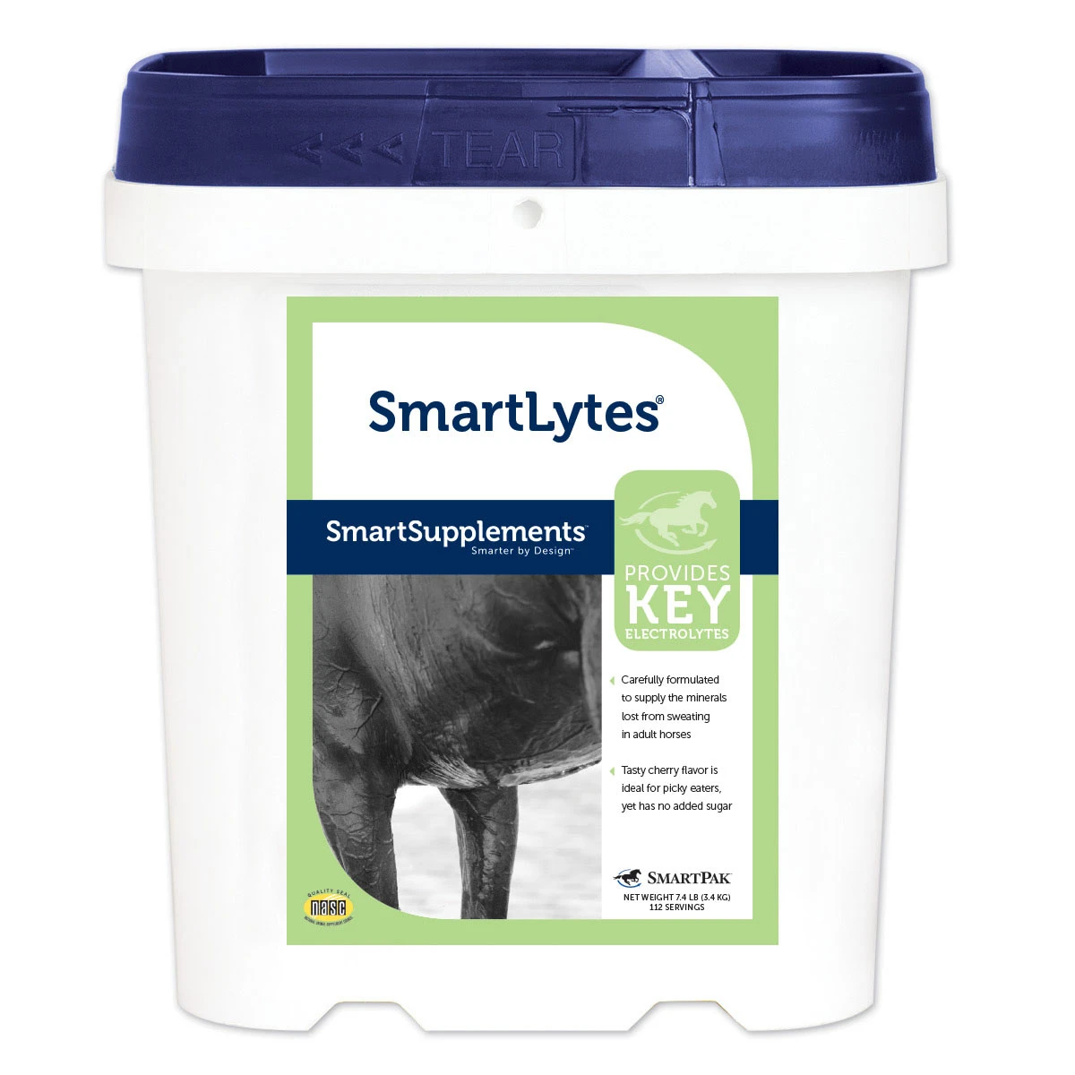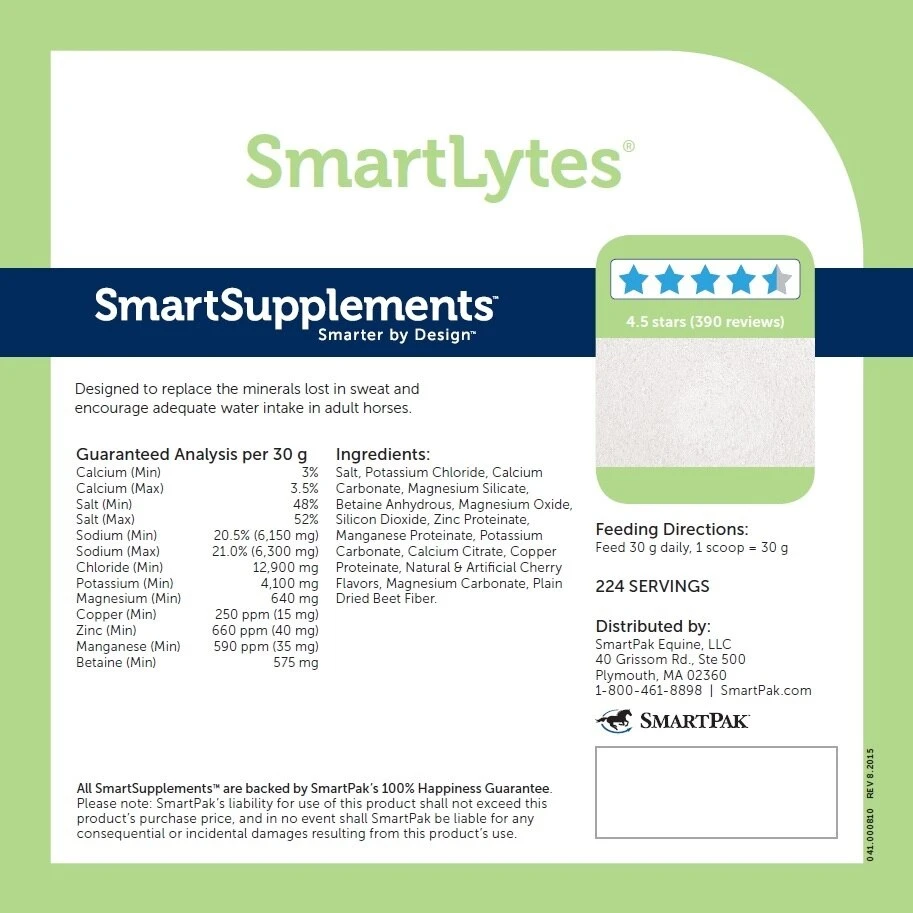 SmartLytes was carefully formulated to mimic the mineral losses in equine sweat. This cherry-flavored powder is sugar-free and contains trimethylglycine (the osmolyte betaine), to help cells maintain normal fluid levels. What a smart electrolyte!