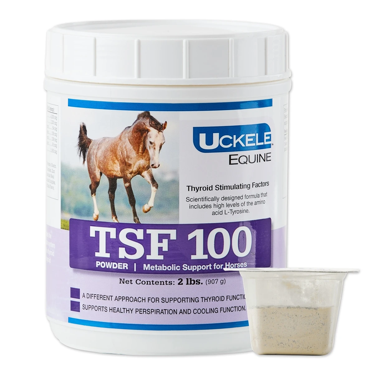TSF 100™ Powder is designed for thyroid stimulating factors. This formula supports metabolic function through high levels of tyrosine, magnesium, copper, zinc, manganese, iodine, and niacin. Tyrosine supports the sympathetic nervous system and is also the parent to the amino acid catecholamine, a class of neurotransmitters which are involved in sweating. TSF 100 Powder’s formula supports normal sweat production, adrenal function, sugar metabolism, and insulin function. Insulin resistance can be linked to anhidrosis, or the inability to sweat, thus TSF 100 Powder can be used as baseline support for horses with metabolic challenges.