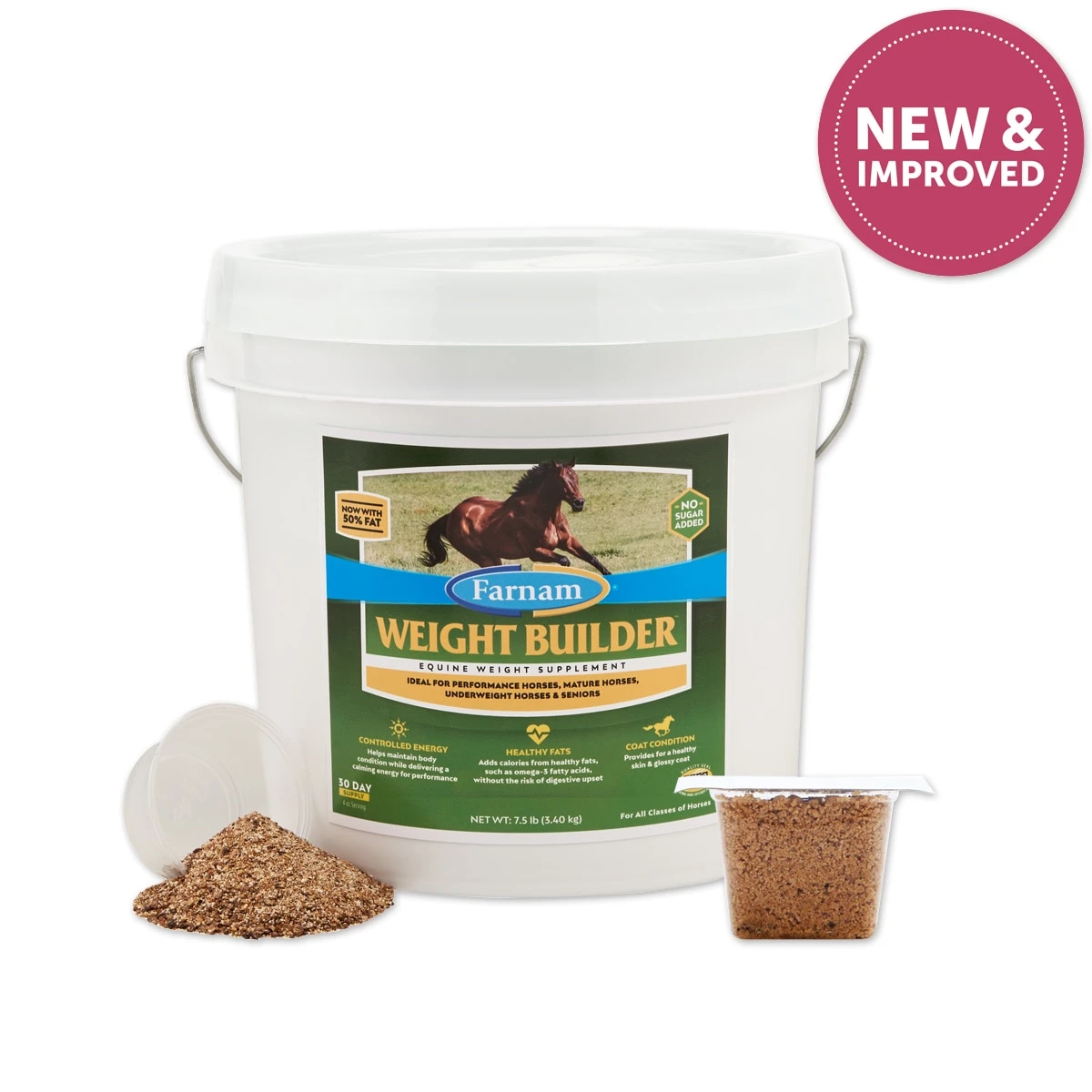 Reformulated to contain 50% fat, Weight Builder™ is ideal for helping performance horses, underweight horses, and seniors reach their optimal body condition and meet training demands without the risk of digestive upset associated with feeding extra grain. Rich in omega 3 fatty acids from flaxseed and heat-stabilized rice bran, and with no sugar added, this weight supplement provides an easily digestible source of “cool” energy. The formula also contains added calcium for a balanced calcium: phosphorus ratio.