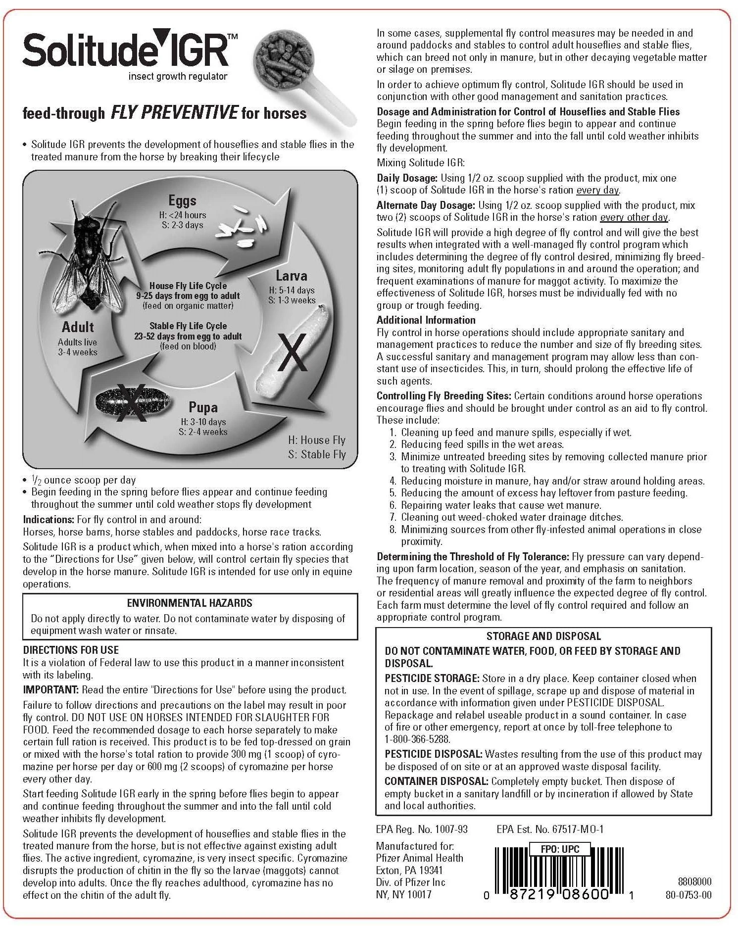 Solitude IGR is an effective, safe, simple, and economical feed-through fly prevention that prevents house and stable fly development. Cyromazine, the active ingredient of Solitude IGR, safely passes through the horse’s system and is excreted in the manure, regulating house and stable fly egg development. Solitude IGR is effective only against immature house and stable flies. As existing adult flies die off, overall fly population is significantly reduced within 4 to 6 weeks. Create a healthier environment for your horse. Cost-effective and easy to use; just add 1/2 oz into your horse’s daily feed regardless of your horse’s breed or size.